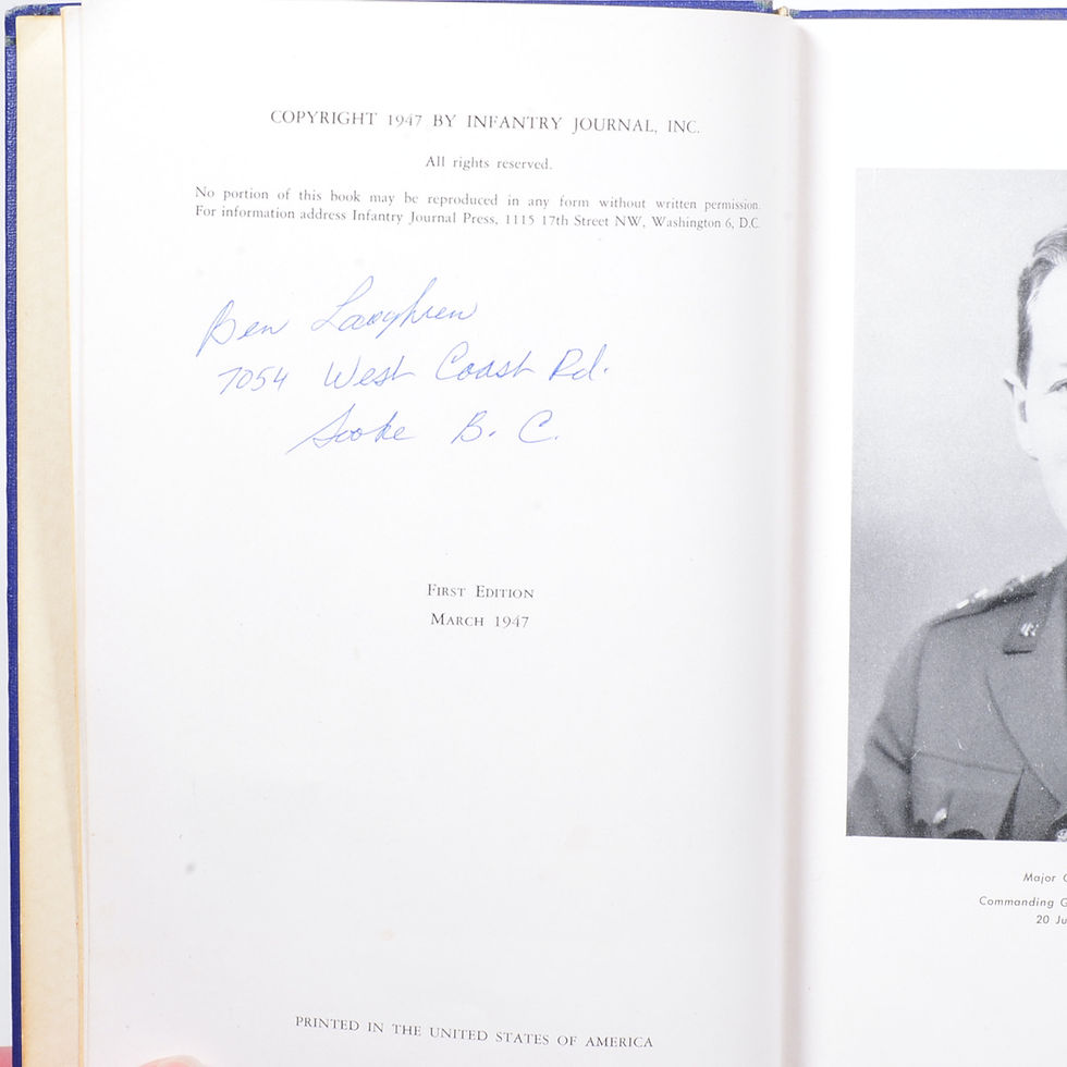 Original replacement medals and 1st edition First Special Service Force unit history that belonged to the family of Sergeant James Herman Laughren (H100435) who was killed in action 13 January 1944 during the Italian campaign. The family lost the soldiers original medals and memorial cross in a house fire in North Bay and ordered this replacement set in the post-war years. The medals are not engraved, and are unused and never mounted. The mounting accessories are included. Correspondence with the family to order the replacement medals is also included with the paperwork. It is a representative set, and includes copies of Herman’s service file. The book is in good used condition, and is personalized to the family, it also has a newspaper clipping glued inside from when Herman attended training in Helena, Montana. With the medals being replacements, the majority of the value of this group is in the book which is extra special being personalized by Herman’s family. $425