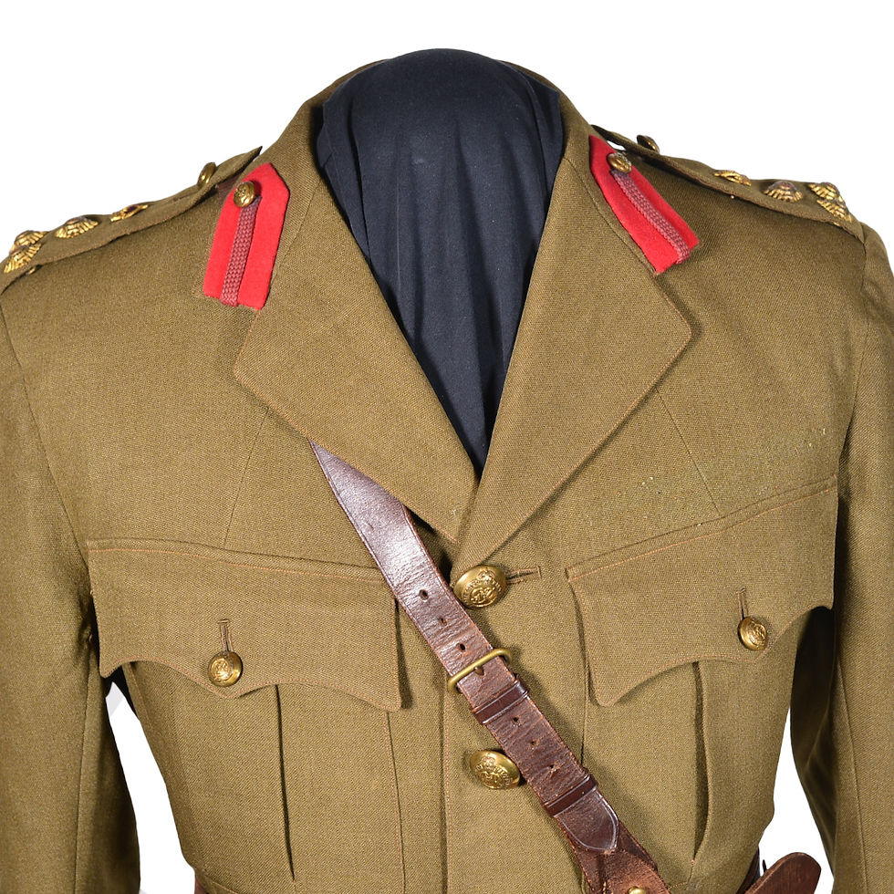 Original Second World War British Staff Officer’s uniform set for a Brigadier General consisting of Service Dress jacket, peak cap, and Sam Browne. The jacket is well executed, being tailor made from light drab gaberdine, featuring open collar, box pleat chest pockets, external lower front pockets, and gauntlet cuffs. The jacket is badged with scarlet gorget patches on the collar, with pips and crown mounted on the shoulder straps for a Brigadier. There are no signs of the gorgets being tampered with, everything appears period done. All the correct George VI Brigadier & Colonel buttons are present. There is evidence that ribbons or medals were worn on the jacket at one time, but they were removed. A very similar jacket is shown on page 128 of the book Drab Serge and Khaki Drill by Grant Tyler and published by Parks Canada. The peak cap is also private tailored by a London maker, featuring the correct hand embroidered Brigadier cap badge and small buttons. The cap is named to “R.W.L. Fellowes” and this cap was with the jacket when we received it, there is potential for further research. There is a Sam Browne belt with supporting strap and provisions for hanging a sword. The Sam Browne came with the uniform set, it is named to “P.E.G. Lobb” and it has been collector added to complete the jacket and cap. A nice worn British made 1942 khaki shirt with collar is also included. This is a solid uniform set that is display ready and fits mannequin nicely. $725