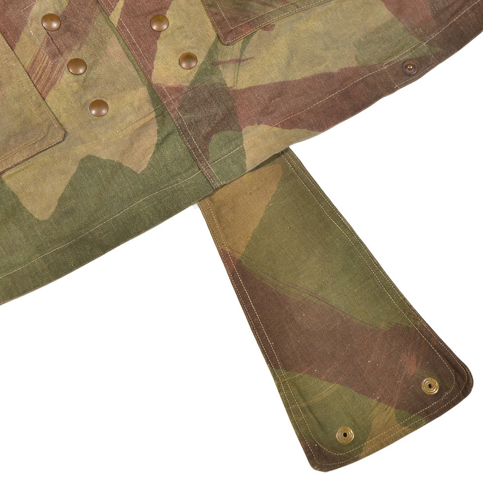 Original Second World War British / Commonwealth windproof smock. These loose cut four pocket smocks were introduced late in the war, and saw extensive use with infantry across North West Europe. In the post-WWII years these smocks were used again by Commonwealth soldiers in Korea, the French in Indochina, and were a mainstay of British special forces into the 1970’s. Excellent condition, without any damage or modification and likely unissued, with bright colours in the coveted brushstroke camouflage, features the original makers tag on the interior in “Size I” which fits a standard modern mannequin perfectly. Great jacket. *Sold*