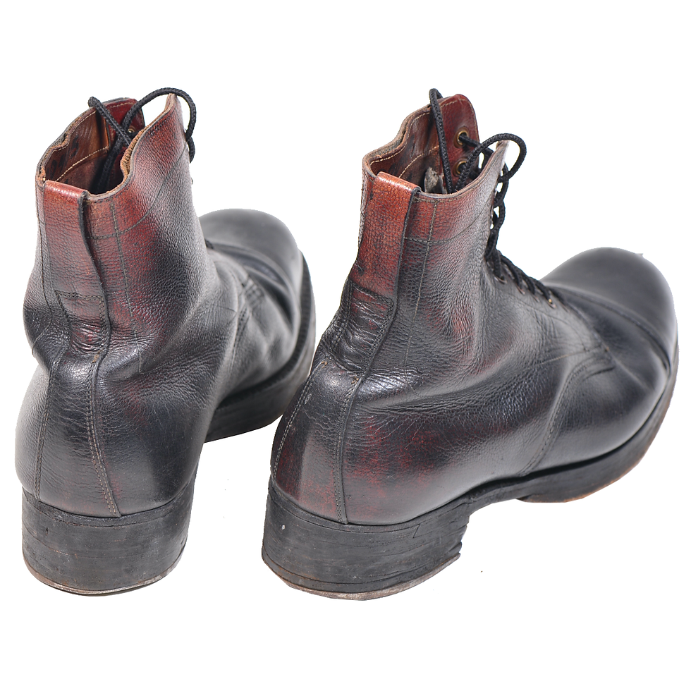 Original Second World War Canadian black leather “ammo” boots. The black “Boot, Ankle, Militia, G.S.” or "ammunition boot" was the standard footwear worn by soldiers of the Canadian Army, including overseas on operations in North West Europe. This pair is used condition, with the laces replaced at some point, and there is an old museum inventory number written inside of them. These were previously part of the well known Jon Denner collection, Jon was pioneer collector who received many items directly from veterans and did some trading with museums many years ago. They are size 8L and they are dated 1945. The boots would be ideal to be used on a mannequin or displayed on their own with other uniform items. $375 *On Hold*