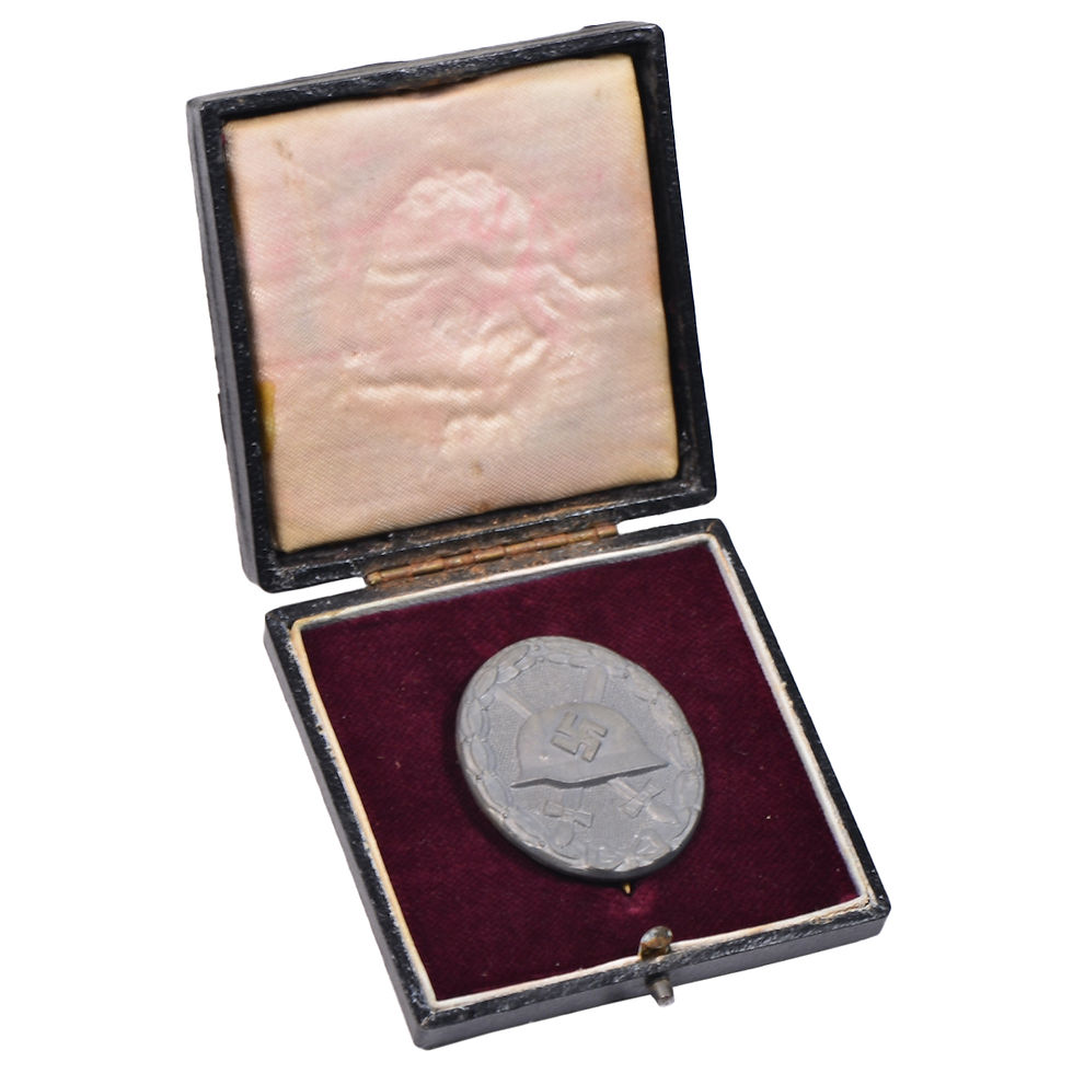 Original Second World War German Silver Wound Badge (SWB) issued to all branches of the Wehrmacht for those who received three or four wounds, or wounds that were very severe. This is a later war zinc alloy example. This badges are known for developing a patina that gives a dripping silver wash appearance. The badge in good as-found condition, with working pin and catch assembly, and it has never been cleaned or tampered with. The badge surfaced in Canada as is presumably a Canadian soldiers souvenir. $110