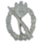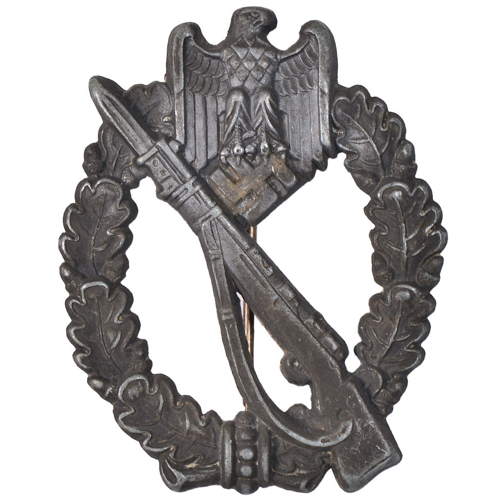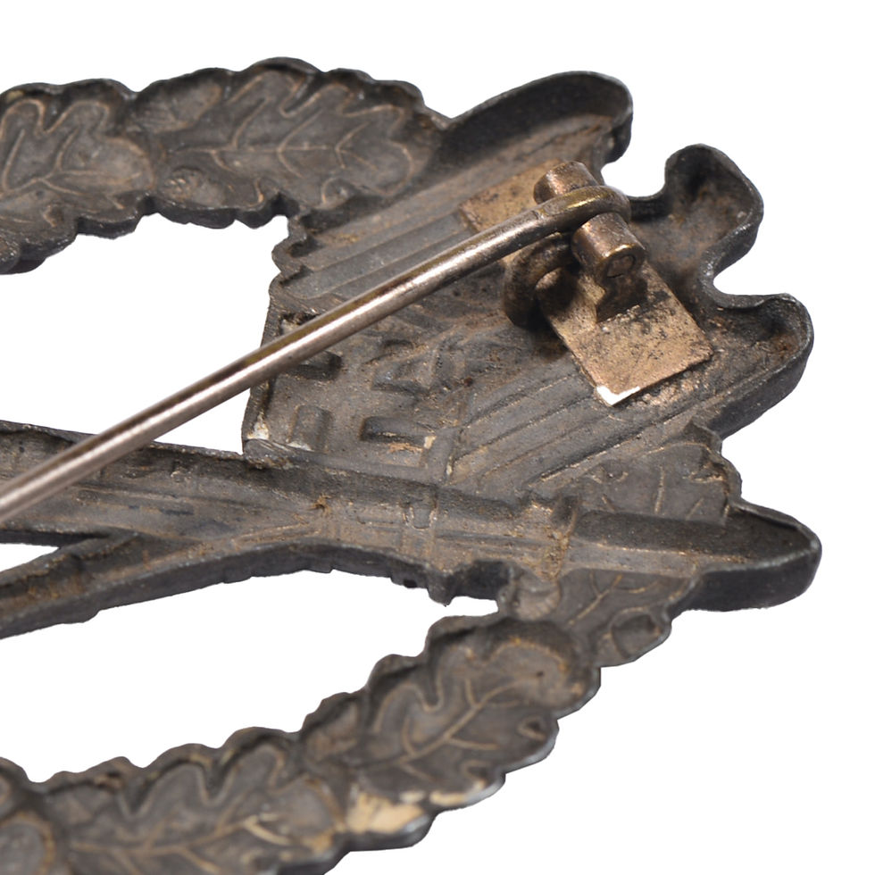 Original Second World War German Infantry Assault Badge (IAB) in Silver. This example is from an unknown maker, and is constructed from stamped silvered buntmetall with wire catch on tiny plate and simple hinge on big plate. An identical example is shown pages 182-183 of The Infantry Assault Badge by Sascha Weber. This example is in worn condition, and the silver finish has turned to a dark patina, and it has not been cleaned or messed with in any way. $185