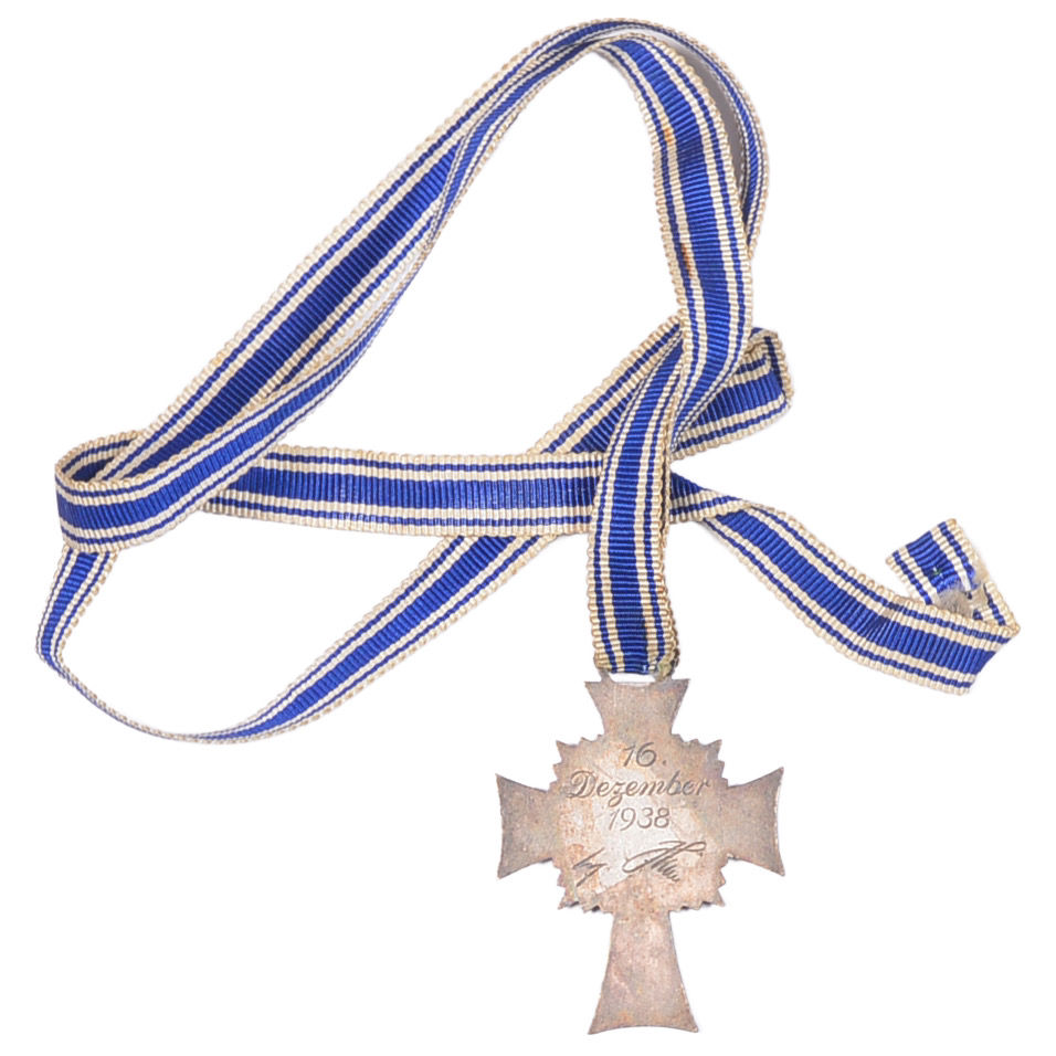 Original Second World War Mother’s Cross in Bronze with Award Document. Background: The Third Reich gave significant recognition to the importance of a woman's role and motherhood to create a strong Germany, leading to the creation of the Ehrenkreuz der Deutschen Mutter (Cross of Honour of the German Mother). The Bronze Cross was awarded to eligible mothers with four or five children. The award and paperwork are both in good condition, never cleaned or tampered with, showing honest age and patina. Both items were discovered together in Canada. $125