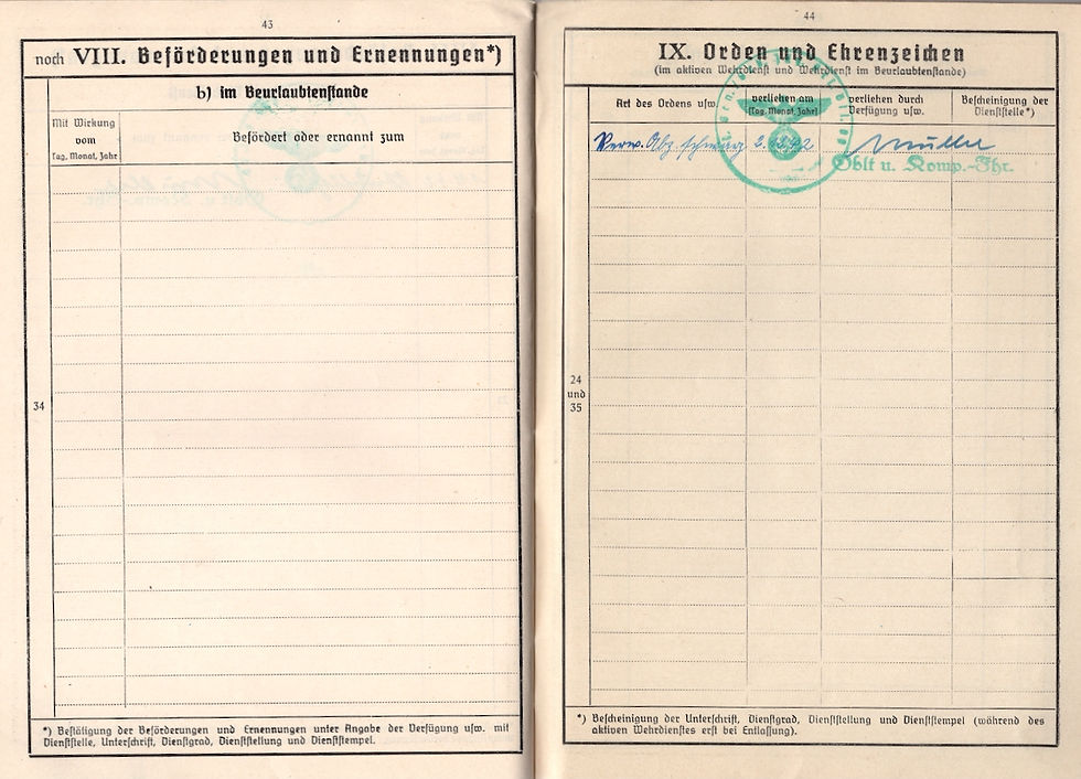 Original Second World War Soldbuch that was issued to Schutzen Adolf Schwiening, who served with Landesschützen-Ausbildungs-Bataillon 17. Landschutzen units were primarily manned with older personnel or wounded soldiers unfit for frontline duties. At the beginning of the war their duties were all rear guard and security duties, guarding POW´s, bridges, installations, transports etc. Later special units like bridge, transport guard units were formed leaving them mainly POW guard duties. Of course some units in occupied territories were also involved in anti partisan operations. Missing pages 13, 14, 15, 16. $100