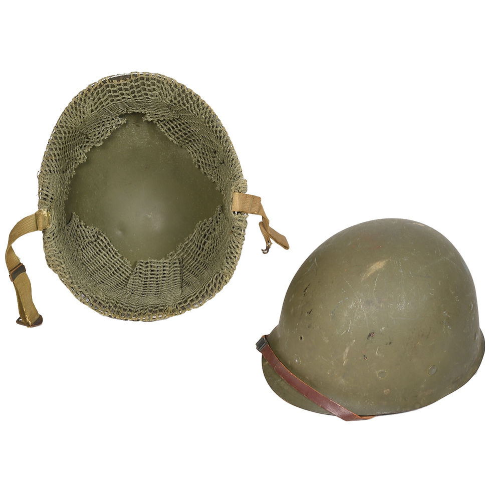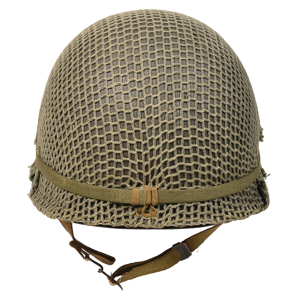Original Second World War U.S. Army M1 combat helmet with fixed bales and original standard issue period mounted camouflage net with built in helmet band. The steel helmet is early production, part of lot number 80C produced by the McCord Radiator corporation. The steel helmet chinstraps are original factory stitched to the fixed bales on each side. The Westinghouse Electric Company helmet liner features early green A washers, sweatband, and nape strap. The liner is complete even with the original fine leather chinstrap and small buckle. The helmet net is the U.S. Army standard issue regulation camouflage net with built in helmet band. This type of net was used in both the European and Pacific theatre, and it appears it has been on the helmet forever and we’ve left it exactly as found and never removed it. If you buy this, and you remove the net, you will be doing significant damage to the artifact and value because it will never look the same again. The entire set is in matching lightly serviced used condition. This helmet comes from our personal collection and was obtained at a Show of Shows event many years ago, this is an ideal example to represent the U.S. Army. $725 *On Hold*
